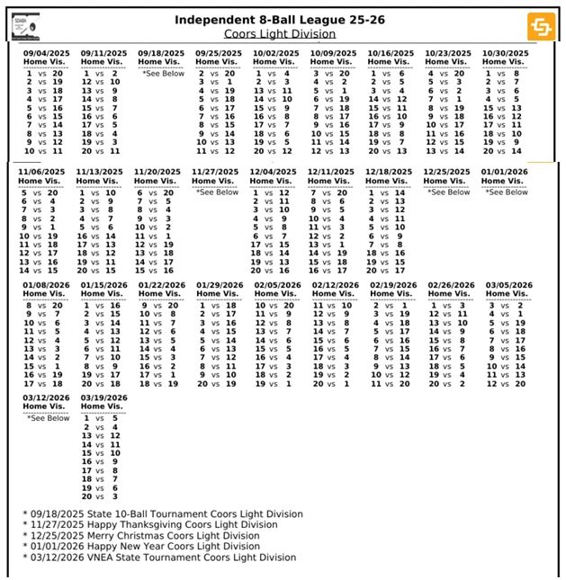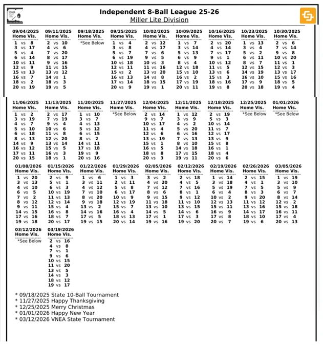 2025-2026 Ind. 8-Ball League 8-Ball Schedule (Look @ Captain list for your team
