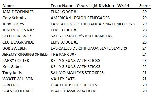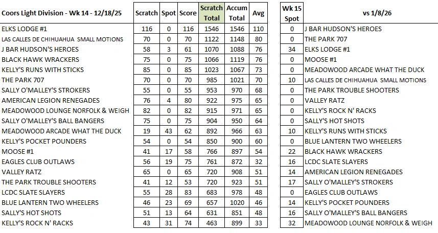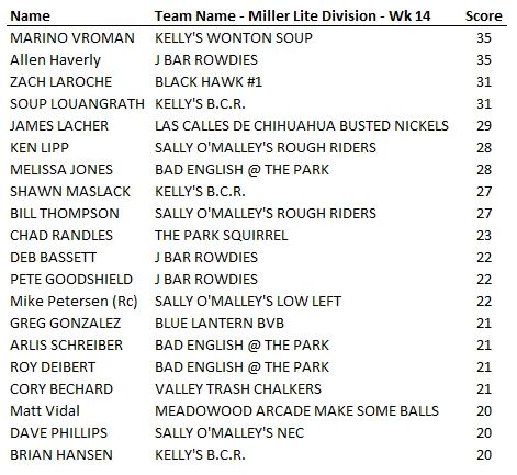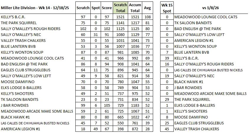 Ind. 8-Ball League Weekly Results - Week 14 - 12/18/25