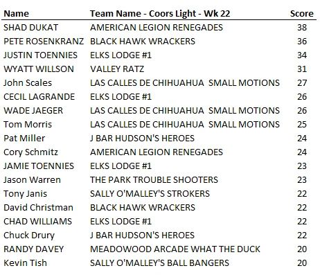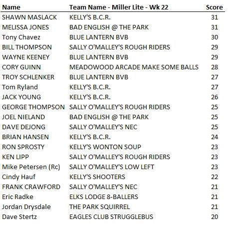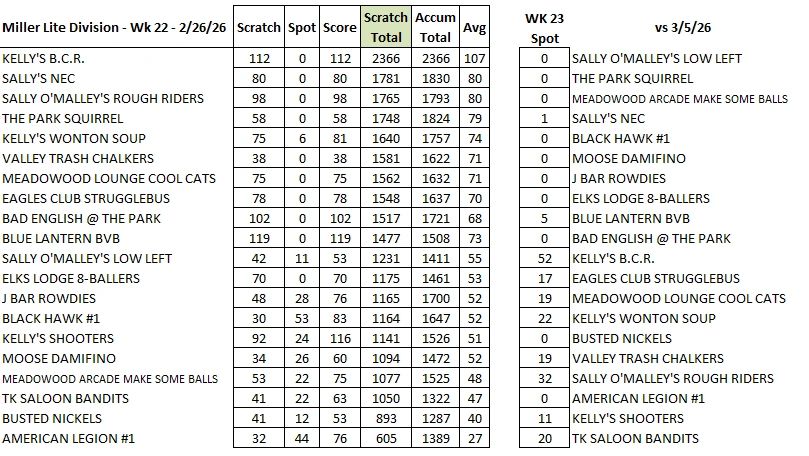 Ind. 8-Ball League Weekly Results - Week 22 - 2/26/26